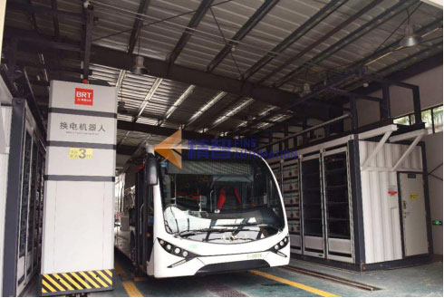 車子進站停靠入位,換電機器人自動識別并更換公交車內能源電池。機器人通過識別,將車內的電池取下并放到兩側的充電架上,能源電池自動進入充電模式;機器人將根據系統提示,將充電架上充滿的能源電池取出并更換至大巴車上,整個換電過程大約9分鐘。